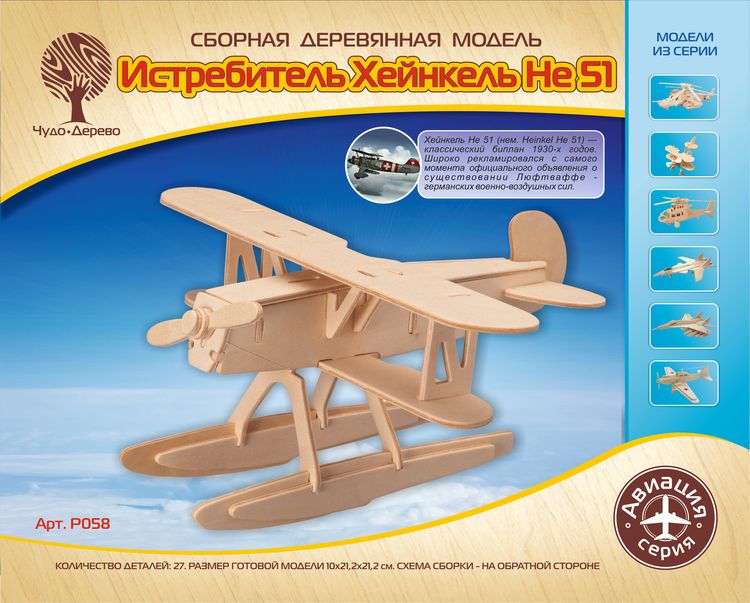 Сборная деревянная модель Истребитель Хенкель He 51, артикул: P058. Комплект включает в себя набор деталей, вырезанных на фанерных листах; схему сборки; наждачную бумагу. Детали скрепляются в порядке и очередности, обозначенной в инструкции. Для прочности соединений рекомендуется использовать клей ПВА (не токсичен, не имеет запаха, после высыхания становится прозрачным, имеет эластичный клеевой шов, при загустевании может быть разбавлен водой). Возрастная ориентация: от 5 до 105 лет.