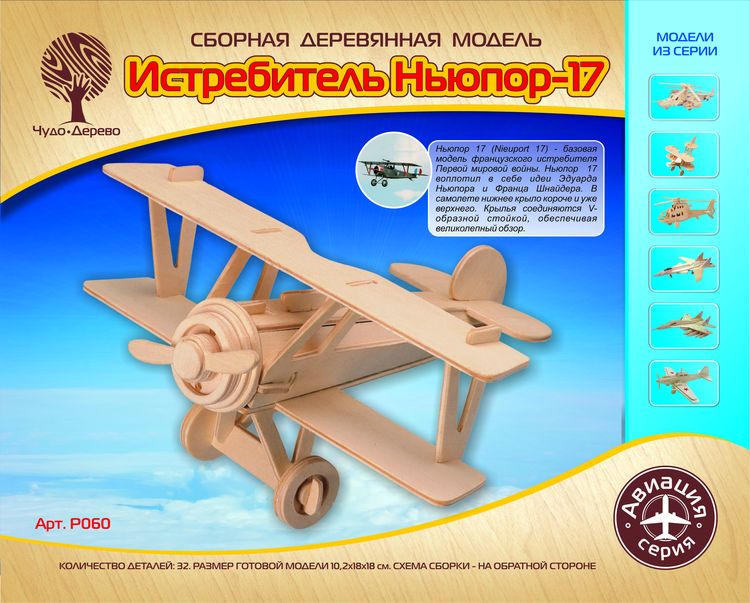 Сборная деревянная модель Истребитель Ньюпорт-17, артикул: P060. Комплект включает в себя набор деталей, вырезанных на фанерных листах; схему сборки; наждачную бумагу. Детали скрепляются в порядке и очередности, обозначенной в инструкции. Для прочности соединений рекомендуется использовать клей ПВА (не токсичен, не имеет запаха, после высыхания становится прозрачным, имеет эластичный клеевой шов, при загустевании может быть разбавлен водой). Возрастная ориентация: от 5 до 105 лет.