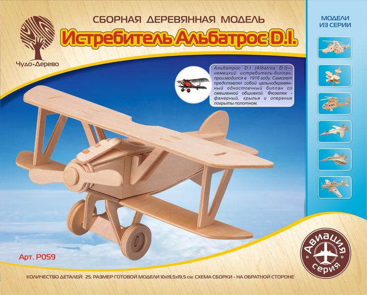 Сборная деревянная модель Истребитель Альбатрос D.I., артикул: P059. Комплект включает в себя набор деталей, вырезанных на фанерных листах; схему сборки; наждачную бумагу. Детали скрепляются в порядке и очередности, обозначенной в инструкции. Для прочности соединений рекомендуется использовать клей ПВА (не токсичен, не имеет запаха, после высыхания становится прозрачным, имеет эластичный клеевой шов, при загустевании может быть разбавлен водой). Возрастная ориентация: от 5 до 105 лет.
