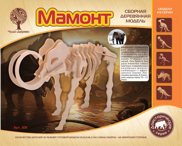 Сборная деревянная модель Мамонт, артикул: J011. Комплект включает в себя набор деталей, вырезанных на фанерных листах; схему сборки; наждачную бумагу. Детали скрепляются в порядке и очередности, обозначенной в инструкции. Для прочности соединений рекомендуется использовать клей ПВА (не токсичен, не имеет запаха, после высыхания становится прозрачным, имеет эластичный клеевой шов, при загустевании может быть разбавлен водой). Возрастная ориентация: от 5 до 105 лет.