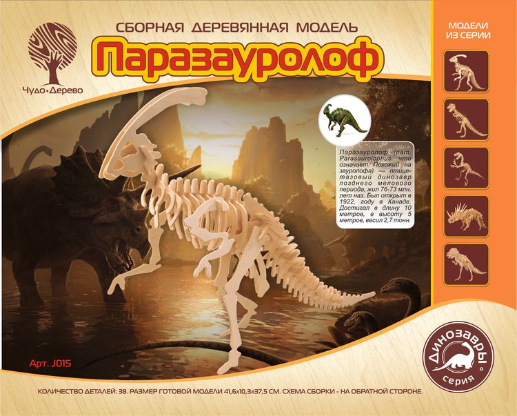 Сборная деревянная модель Паразавролоф, артикул: J015. Комплект включает в себя набор деталей, вырезанных на фанерных листах; схему сборки; наждачную бумагу. Детали скрепляются в порядке и очередности, обозначенной в инструкции. Для прочности соединений рекомендуется использовать клей ПВА (не токсичен, не имеет запаха, после высыхания становится прозрачным, имеет эластичный клеевой шов, при загустевании может быть разбавлен водой). Возрастная ориентация: от 5 до 105 лет.
