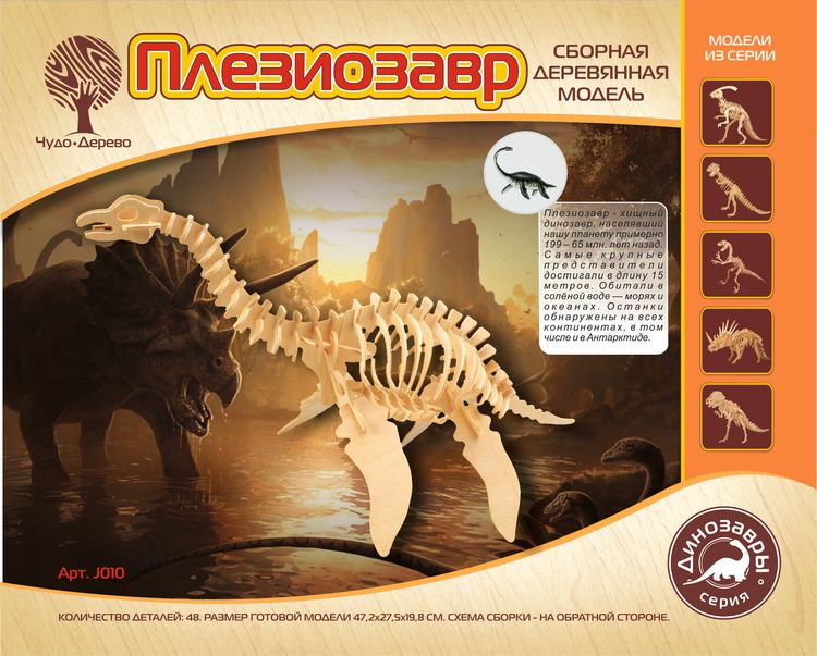 Сборная деревянная модель Плезиозавр, артикул: J010. Комплект включает в себя набор деталей, вырезанных на фанерных листах; схему сборки; наждачную бумагу. Детали скрепляются в порядке и очередности, обозначенной в инструкции. Для прочности соединений рекомендуется использовать клей ПВА (не токсичен, не имеет запаха, после высыхания становится прозрачным, имеет эластичный клеевой шов, при загустевании может быть разбавлен водой). Возрастная ориентация: от 5 до 105 лет.