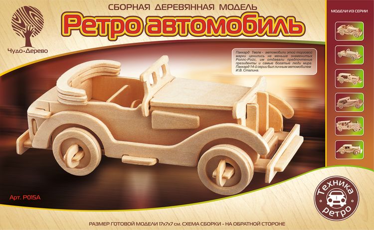Сборная деревянная модель Паккард (малый), артикул: P015A. Комплект включает в себя набор деталей, вырезанных на фанерных листах; схему сборки; наждачную бумагу. Детали скрепляются в порядке и очередности, обозначенной в инструкции. Для прочности соединений рекомендуется использовать клей ПВА (не токсичен, не имеет запаха, после высыхания становится прозрачным, имеет эластичный клеевой шов, при загустевании может быть разбавлен водой). Возрастная ориентация: от 5 до 105 лет.