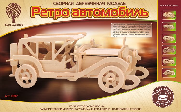Сборная деревянная модель Ретро автомобиль (Санбин), артикул: P017. Комплект включает в себя набор деталей, вырезанных на фанерных листах; схему сборки; наждачную бумагу. Детали скрепляются в порядке и очередности, обозначенной в инструкции. Для прочности соединений рекомендуется использовать клей ПВА (не токсичен, не имеет запаха, после высыхания становится прозрачным, имеет эластичный клеевой шов, при загустевании может быть разбавлен водой). Возрастная ориентация: от 5 до 105 лет.
