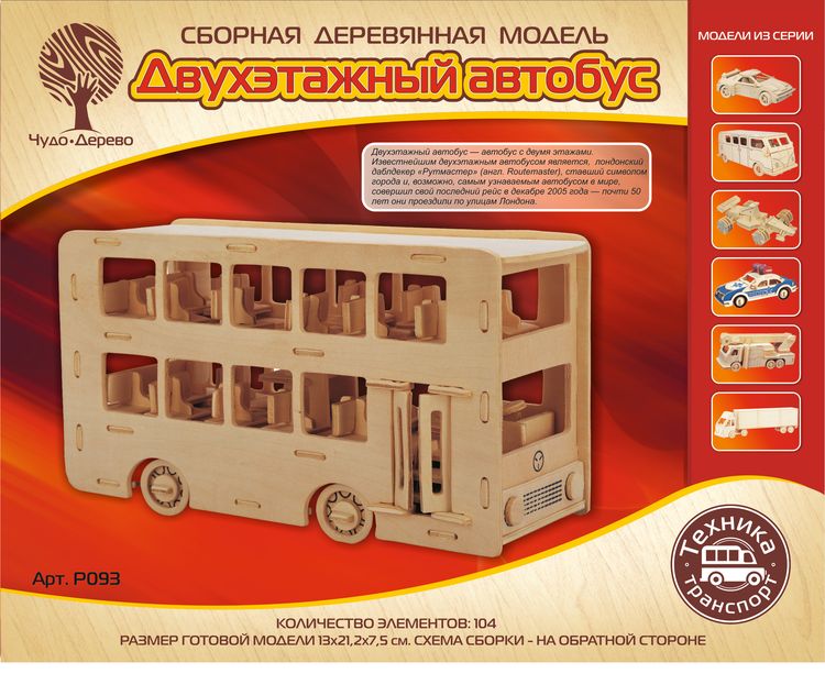 Сборная деревянная модель Двухэтажный автобус, артикул: P093. Комплект включает в себя набор деталей, вырезанных на фанерных листах; схему сборки; наждачную бумагу. Детали скрепляются в порядке и очередности, обозначенной в инструкции. Для прочности соединений рекомендуется использовать клей ПВА (не токсичен, не имеет запаха, после высыхания становится прозрачным, имеет эластичный клеевой шов, при загустевании может быть разбавлен водой). Возрастная ориентация: от 5 до 105 лет.