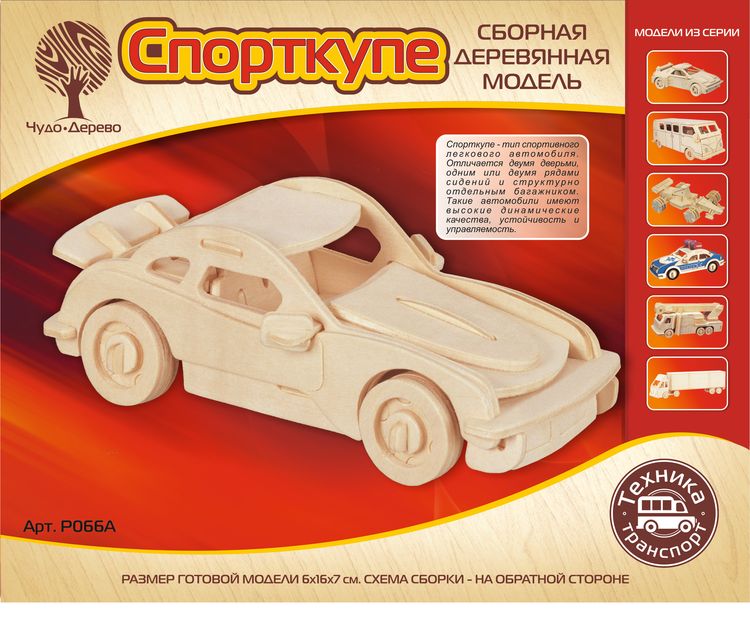 Сборная деревянная модель Спорткупе (малый), артикул: P066A. Комплект включает в себя набор деталей, вырезанных на фанерных листах; схему сборки; наждачную бумагу. Детали скрепляются в порядке и очередности, обозначенной в инструкции. Для прочности соединений рекомендуется использовать клей ПВА (не токсичен, не имеет запаха, после высыхания становится прозрачным, имеет эластичный клеевой шов, при загустевании может быть разбавлен водой). Возрастная ориентация: от 5 до 105 лет.