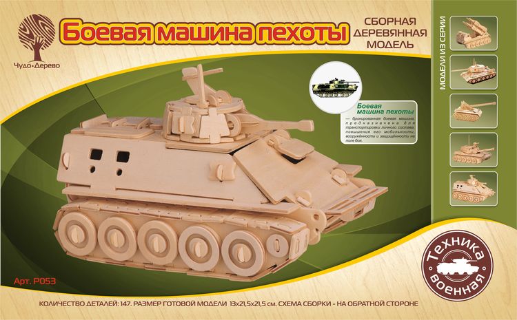 Сборная деревянная модель Боевая машина пехоты, артикул: P053. Комплект включает в себя набор деталей, вырезанных на фанерных листах; схему сборки; наждачную бумагу. Детали скрепляются в порядке и очередности, обозначенной в инструкции. Для прочности соединений рекомендуется использовать клей ПВА (не токсичен, не имеет запаха, после высыхания становится прозрачным, имеет эластичный клеевой шов, при загустевании может быть разбавлен водой). Возрастная ориентация: от 5 до 105 лет.