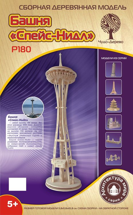 Сборная деревянная модель Башня Спейс-Нидл, артикул: P180. Комплект включает в себя набор деталей, вырезанных на фанерных листах; схему сборки; наждачную бумагу. Детали скрепляются в порядке и очередности, обозначенной в инструкции. Для прочности соединений рекомендуется использовать клей ПВА (не токсичен, не имеет запаха, после высыхания становится прозрачным, имеет эластичный клеевой шов, при загустевании может быть разбавлен водой). Возрастная ориентация: от 5 до 105 лет.