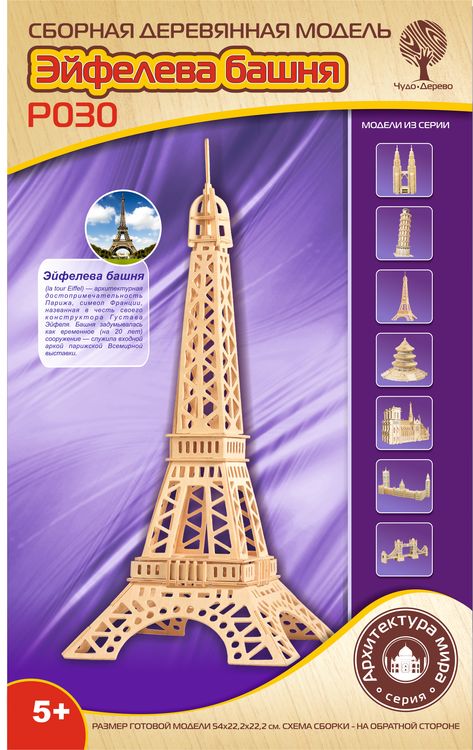Сборная деревянная модель Эйфелева башня, артикул: P030. Комплект включает в себя набор деталей, вырезанных на фанерных листах; схему сборки; наждачную бумагу. Детали скрепляются в порядке и очередности, обозначенной в инструкции. Для прочности соединений рекомендуется использовать клей ПВА (не токсичен, не имеет запаха, после высыхания становится прозрачным, имеет эластичный клеевой шов, при загустевании может быть разбавлен водой). Возрастная ориентация: от 5 до 105 лет.