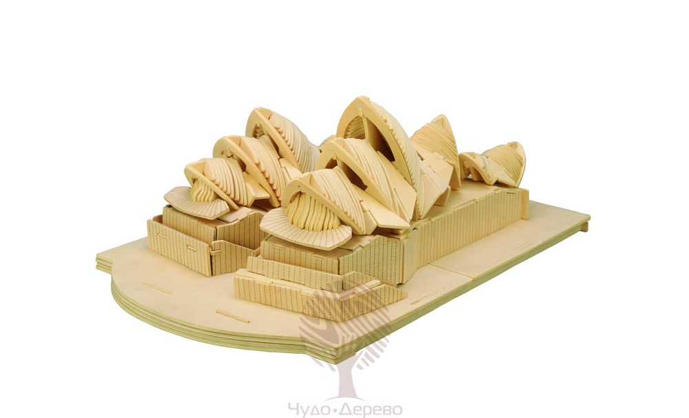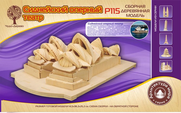 Сборная деревянная модель Сиднейский оперный театр, артикул: P115. Комплект включает в себя набор деталей, вырезанных на фанерных листах; схему сборки; наждачную бумагу. Детали скрепляются в порядке и очередности, обозначенной в инструкции. Для прочности соединений рекомендуется использовать клей ПВА (не токсичен, не имеет запаха, после высыхания становится прозрачным, имеет эластичный клеевой шов, при загустевании может быть разбавлен водой). Возрастная ориентация: от 5 до 105 лет.
