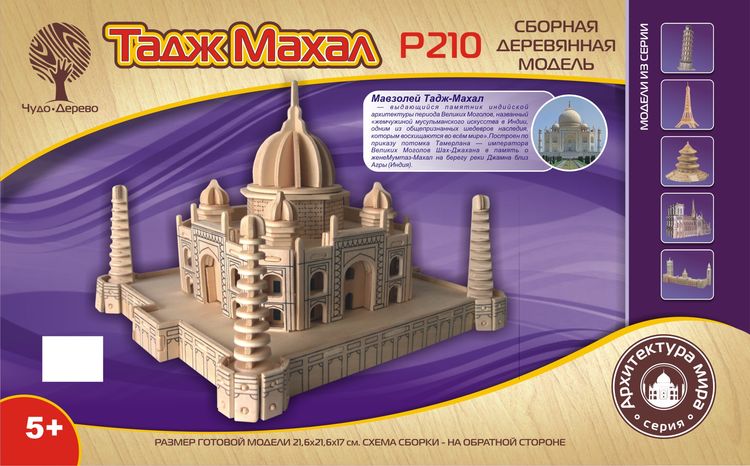 Сборная деревянная модель Тадж Махал, артикул: P210. Комплект включает в себя набор деталей, вырезанных на фанерных листах; схему сборки; наждачную бумагу. Детали скрепляются в порядке и очередности, обозначенной в инструкции. Для прочности соединений рекомендуется использовать клей ПВА (не токсичен, не имеет запаха, после высыхания становится прозрачным, имеет эластичный клеевой шов, при загустевании может быть разбавлен водой). Возрастная ориентация: от 5 до 105 лет.