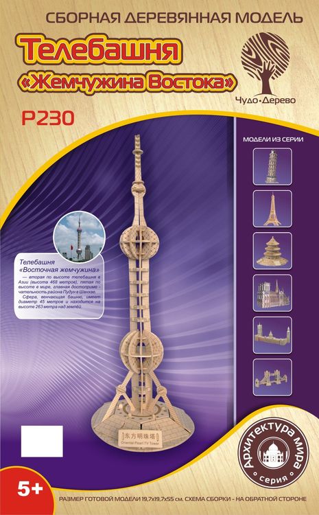 Сборная деревянная модель Телебашня "Жемчужина Востока", артикул: P230. Комплект включает в себя набор деталей, вырезанных на фанерных листах; схему сборки; наждачную бумагу. Детали скрепляются в порядке и очередности, обозначенной в инструкции. Для прочности соединений рекомендуется использовать клей ПВА (не токсичен, не имеет запаха, после высыхания становится прозрачным, имеет эластичный клеевой шов, при загустевании может быть разбавлен водой). Возрастная ориентация: от 5 до 105 лет.