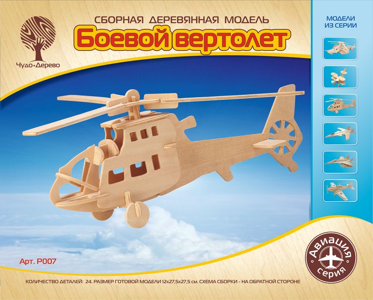 Сборная деревянная модель Боевой вертолет, артикул: P007. Комплект включает в себя набор деталей, вырезанных на фанерных листах; схему сборки; наждачную бумагу. Детали скрепляются в порядке и очередности, обозначенной в инструкции. Для прочности соединений рекомендуется использовать клей ПВА (не токсичен, не имеет запаха, после высыхания становится прозрачным, имеет эластичный клеевой шов, при загустевании может быть разбавлен водой). Возрастная ориентация: от 5 до 105 лет.
