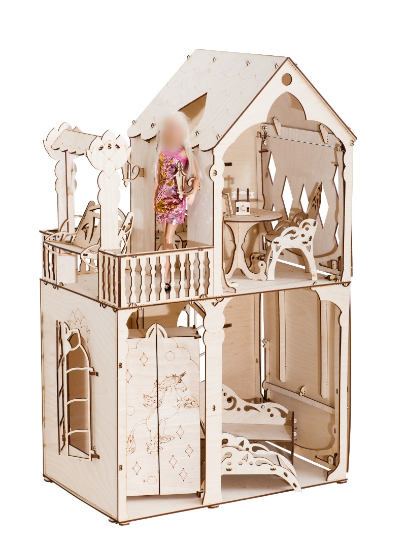 На домике нарисован цветок, который ребенок может раскрасить, например, гуашью. Раскрасить можно и единорога, а так же и всю мебель - краски хорошо ложатся на поверхность дерева. Створки окон открываются. Конструкция дома крепкая, выдерживает до кг нагрузки. Собирается без клея. Товар сертифицирован.