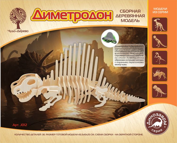 Сборная деревянная модель Диметродон, артикул: J012. Комплект включает в себя набор деталей, вырезанных на фанерных листах; схему сборки; наждачную бумагу. Детали скрепляются в порядке и очередности, обозначенной в инструкции. Для прочности соединений рекомендуется использовать клей ПВА (не токсичен, не имеет запаха, после высыхания становится прозрачным, имеет эластичный клеевой шов, при загустевании может быть разбавлен водой). Возрастная ориентация: от 5 до 105 лет.