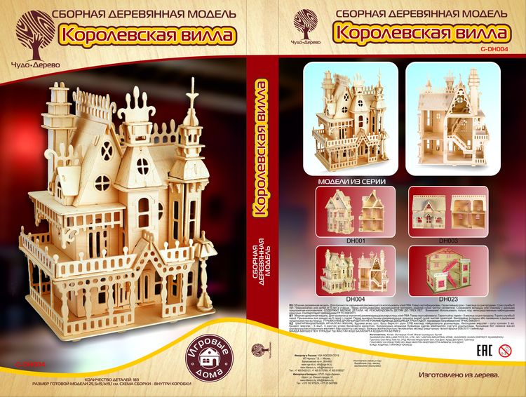 Сборная деревянная модель Королевская вилла, артикул: G-DH004. Комплект включает в себя набор деталей, вырезанных на фанерных листах; схему сборки; наждачную бумагу. Детали скрепляются в порядке и очередности, обозначенной в инструкции. Для прочности соединений рекомендуется использовать клей ПВА (не токсичен, не имеет запаха, после высыхания становится прозрачным, имеет эластичный клеевой шов, при загустевании может быть разбавлен водой). Возрастная ориентация: от 5 до 105 лет.