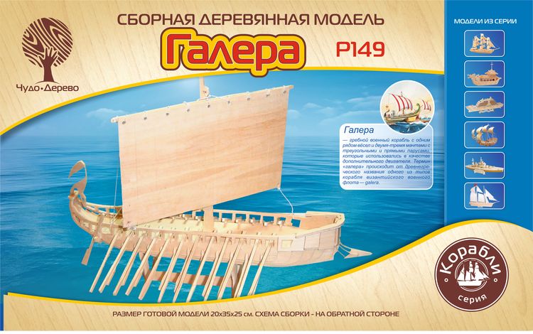Сборная деревянная модель Галера, артикул: P149. Комплект включает в себя набор деталей, вырезанных на фанерных листах; схему сборки; наждачную бумагу. Детали скрепляются в порядке и очередности, обозначенной в инструкции. Для прочности соединений рекомендуется использовать клей ПВА (не токсичен, не имеет запаха, после высыхания становится прозрачным, имеет эластичный клеевой шов, при загустевании может быть разбавлен водой). Возрастная ориентация: от 5 до 105 лет.