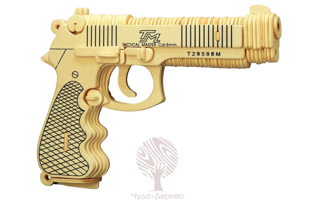Сборная деревянная модель Пистолет Беретта M-92F, артикул: P112. Комплект включает в себя набор деталей, вырезанных на фанерных листах; схему сборки; наждачную бумагу. Детали скрепляются в порядке и очередности, обозначенной в инструкции. Для прочности соединений рекомендуется использовать клей ПВА (не токсичен, не имеет запаха, после высыхания становится прозрачным, имеет эластичный клеевой шов, при загустевании может быть разбавлен водой). Возрастная ориентация: от 5 до 105 лет.