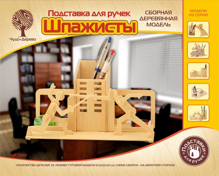 Сборная деревянная модель Подставка для ручек "Шпажисты", артикул: S001. Комплект включает в себя набор деталей, вырезанных на фанерных листах; схему сборки; наждачную бумагу. Детали скрепляются в порядке и очередности, обозначенной в инструкции. Для прочности соединений рекомендуется использовать клей ПВА (не токсичен, не имеет запаха, после высыхания становится прозрачным, имеет эластичный клеевой шов, при загустевании может быть разбавлен водой). Возрастная ориентация: от 5 до 105 лет.