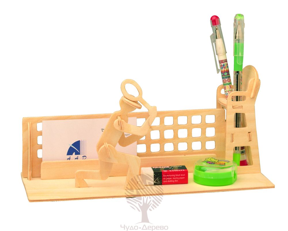 Сборная деревянная модель Подставка для ручек "Теннисист", артикул: S007. Комплект включает в себя набор деталей, вырезанных на фанерных листах; схему сборки; наждачную бумагу. Детали скрепляются в порядке и очередности, обозначенной в инструкции. Для прочности соединений рекомендуется использовать клей ПВА (не токсичен, не имеет запаха, после высыхания становится прозрачным, имеет эластичный клеевой шов, при загустевании может быть разбавлен водой). Возрастная ориентация: от 5 до 105 лет.