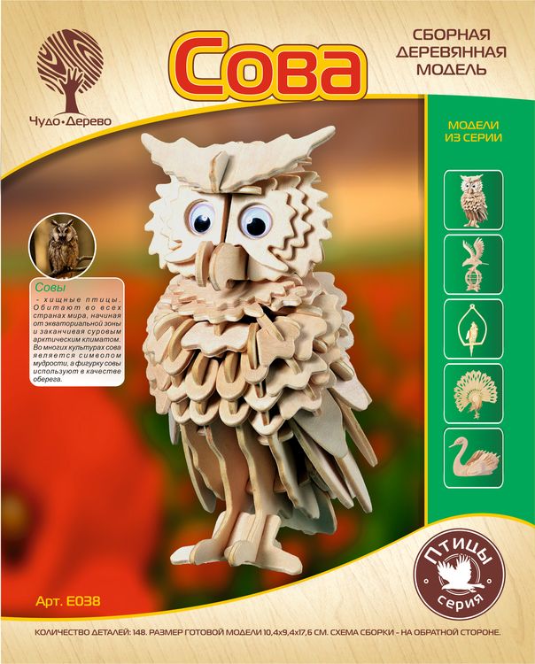 Сборная деревянная модель Сова, артикул: E038. Комплект включает в себя набор деталей, вырезанных на фанерных листах; схему сборки; наждачную бумагу. Детали скрепляются в порядке и очередности, обозначенной в инструкции. Для прочности соединений рекомендуется использовать клей ПВА (не токсичен, не имеет запаха, после высыхания становится прозрачным, имеет эластичный клеевой шов, при загустевании может быть разбавлен водой). Возрастная ориентация: от 5 до 105 лет.