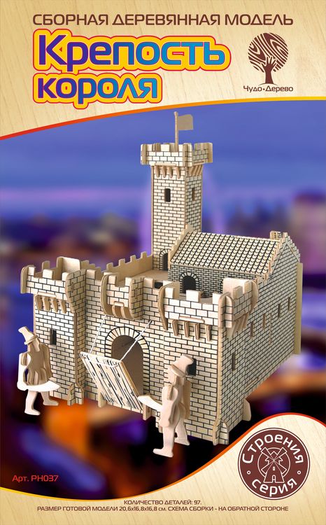 Сборная деревянная модель Крепость короля, артикул: PH037. Комплект включает в себя набор деталей, вырезанных на фанерных листах; схему сборки; наждачную бумагу. Детали скрепляются в порядке и очередности, обозначенной в инструкции. Для прочности соединений рекомендуется использовать клей ПВА (не токсичен, не имеет запаха, после высыхания становится прозрачным, имеет эластичный клеевой шов, при загустевании может быть разбавлен водой). Возрастная ориентация: от 5 до 105 лет.