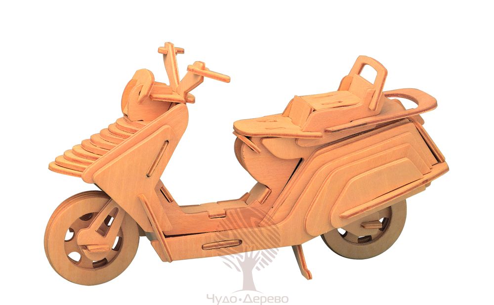 Сборная деревянная модель Мотороллер, артикул: P021. Комплект включает в себя набор деталей, вырезанных на фанерных листах; схему сборки; наждачную бумагу. Детали скрепляются в порядке и очередности, обозначенной в инструкции. Для прочности соединений рекомендуется использовать клей ПВА (не токсичен, не имеет запаха, после высыхания становится прозрачным, имеет эластичный клеевой шов, при загустевании может быть разбавлен водой). Возрастная ориентация: от 5 до 105 лет.
