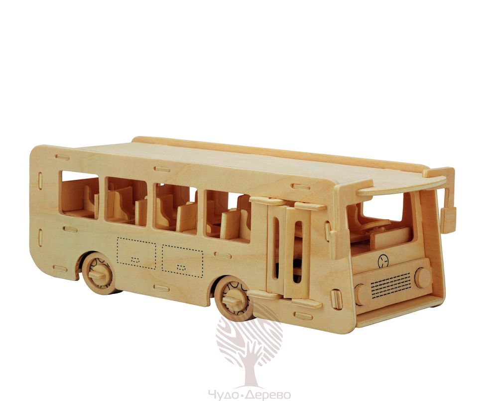 Сборная деревянная модель Автобус, артикул: P092. Комплект включает в себя набор деталей, вырезанных на фанерных листах; схему сборки; наждачную бумагу. Детали скрепляются в порядке и очередности, обозначенной в инструкции. Для прочности соединений рекомендуется использовать клей ПВА (не токсичен, не имеет запаха, после высыхания становится прозрачным, имеет эластичный клеевой шов, при загустевании может быть разбавлен водой). Возрастная ориентация: от 5 до 105 лет.
