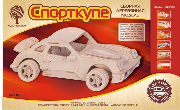Сборная деревянная модель Спорткупе, артикул: P066. Комплект включает в себя набор деталей, вырезанных на фанерных листах; схему сборки; наждачную бумагу. Детали скрепляются в порядке и очередности, обозначенной в инструкции. Для прочности соединений рекомендуется использовать клей ПВА (не токсичен, не имеет запаха, после высыхания становится прозрачным, имеет эластичный клеевой шов, при загустевании может быть разбавлен водой). Возрастная ориентация: от 5 до 105 лет.