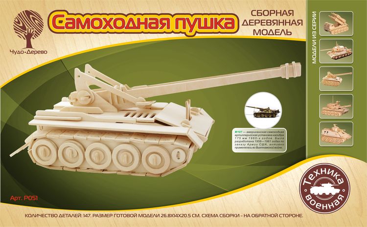 Сборная деревянная модель Самоходная пушка, артикул: P051. Комплект включает в себя набор деталей, вырезанных на фанерных листах; схему сборки; наждачную бумагу. Детали скрепляются в порядке и очередности, обозначенной в инструкции. Для прочности соединений рекомендуется использовать клей ПВА (не токсичен, не имеет запаха, после высыхания становится прозрачным, имеет эластичный клеевой шов, при загустевании может быть разбавлен водой). Возрастная ориентация: от 5 до 105 лет.