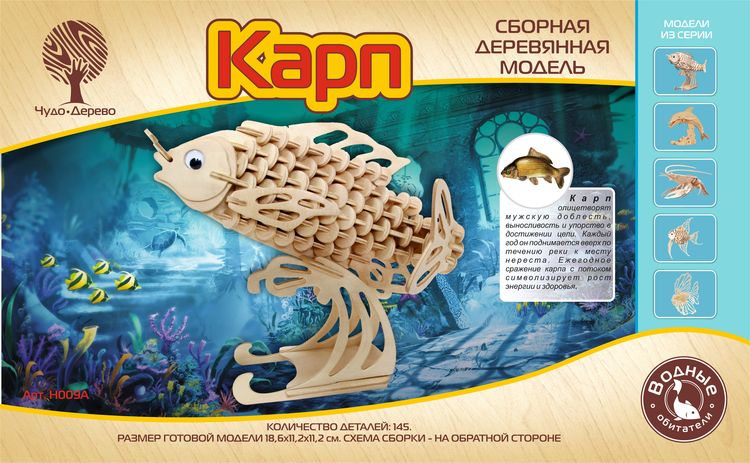 Сборная деревянная модель Карп, артикул: H009A. Комплект включает в себя набор деталей, вырезанных на фанерных листах; схему сборки; наждачную бумагу. Детали скрепляются в порядке и очередности, обозначенной в инструкции. Для прочности соединений рекомендуется использовать клей ПВА (не токсичен, не имеет запаха, после высыхания становится прозрачным, имеет эластичный клеевой шов, при загустевании может быть разбавлен водой). Возрастная ориентация: от 5 до 105 лет.