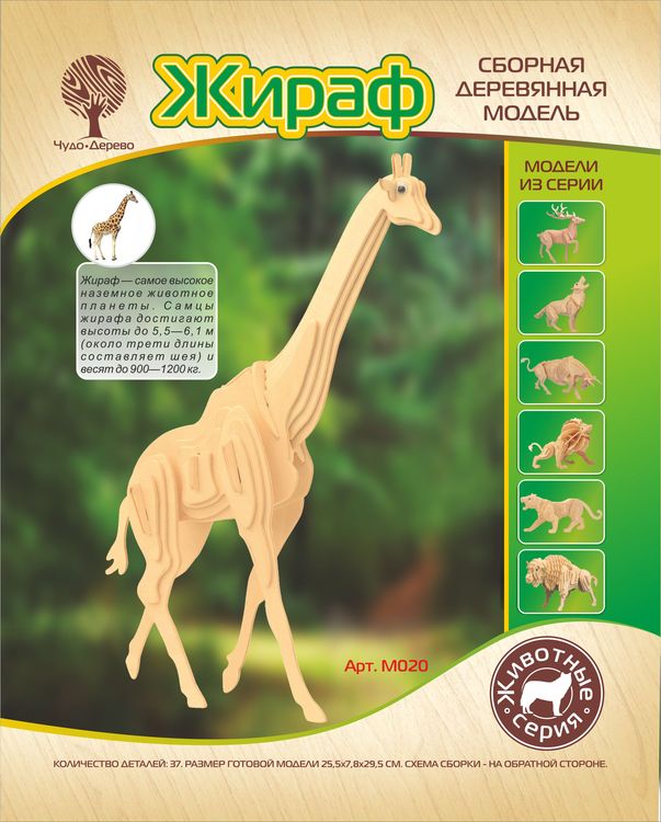 Сборная деревянная модель Жираф, артикул: M020. Комплект включает в себя набор деталей, вырезанных на фанерных листах; схему сборки; наждачную бумагу. Детали скрепляются в порядке и очередности, обозначенной в инструкции. Для прочности соединений рекомендуется использовать клей ПВА (не токсичен, не имеет запаха, после высыхания становится прозрачным, имеет эластичный клеевой шов, при загустевании может быть разбавлен водой). Возрастная ориентация: от 5 до 105 лет.