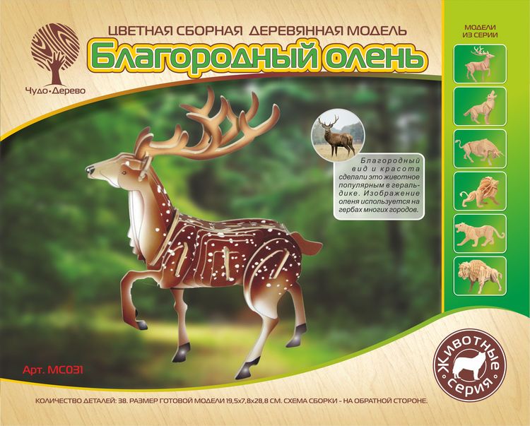 Сборная деревянная цветная модель Благородный олень (цветной), артикул: MC031. Комплект включает в себя набор деталей, вырезанных на фанерных листах; схему сборки; наждачную бумагу. Детали скрепляются в порядке и очередности, обозначенной в инструкции. Для прочности соединений рекомендуется использовать клей ПВА (не токсичен, не имеет запаха, после высыхания становится прозрачным, имеет эластичный клеевой шов, при загустевании может быть разбавлен водой). Возрастная ориентация: от 5 до 105 лет.