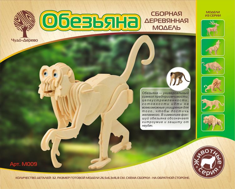 Сборная деревянная модель Обезьяна, артикул: M009. Комплект включает в себя набор деталей, вырезанных на фанерных листах; схему сборки; наждачную бумагу. Детали скрепляются в порядке и очередности, обозначенной в инструкции. Для прочности соединений рекомендуется использовать клей ПВА (не токсичен, не имеет запаха, после высыхания становится прозрачным, имеет эластичный клеевой шов, при загустевании может быть разбавлен водой). Возрастная ориентация: от 5 до 105 лет.